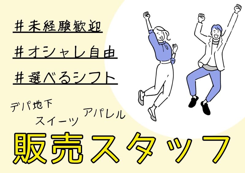 【お仕事内容】 店頭の基本業務全般 商品運搬、補充、列案内(お客様誘導・呼び込み)、レジなどをしていただきます! 大丸地下1Fにある店舗でお仕事をお...- 未経験歓迎